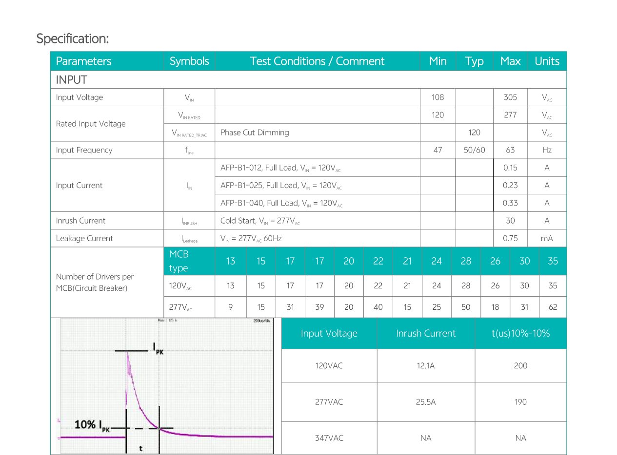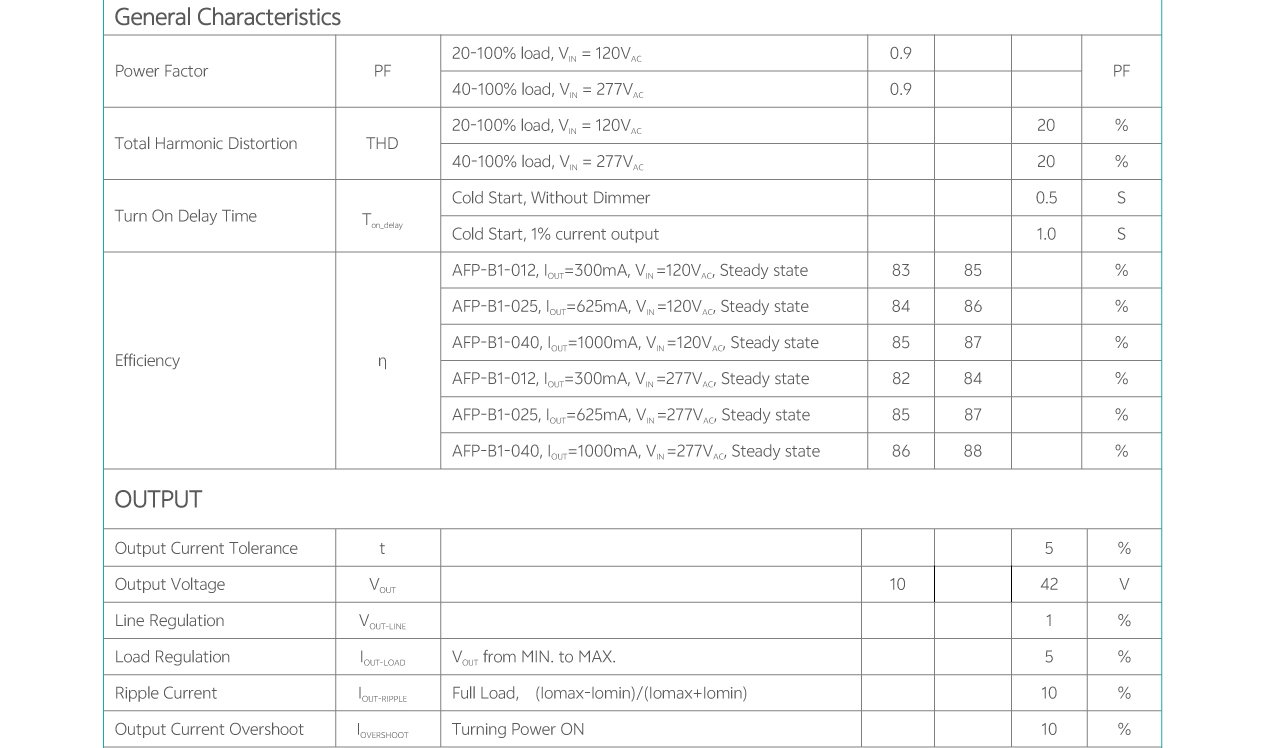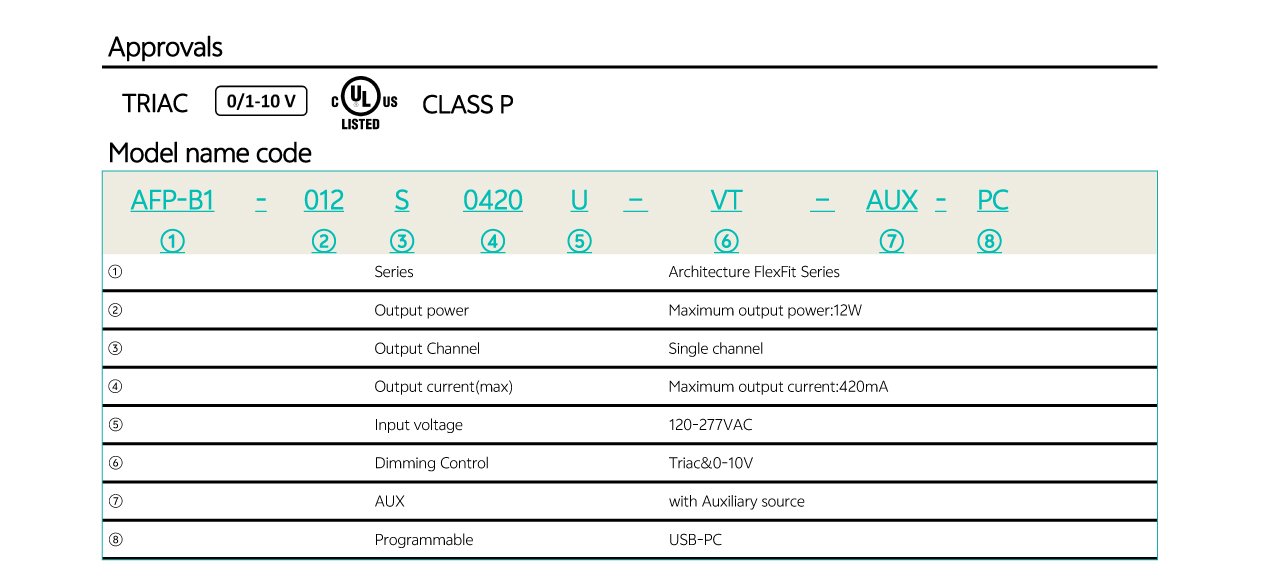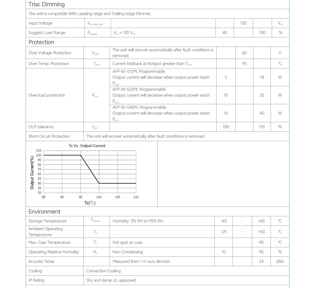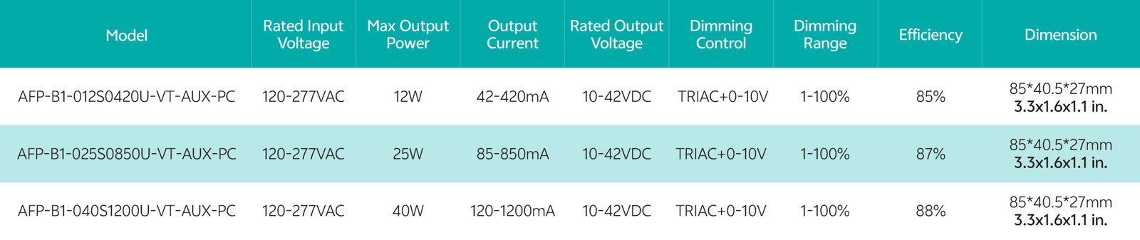 Home/All Products/AFP-B1 Family: 12W 25W 40W AFP-B1 Family: 12W 25W 40W Extreme compact form factor Five‐in‐one dimming: 0-10V,1-10V,MLV,ELV,TRIAC True 1% dimming over full output current range Wide current range coverage: 42-1200 mA High power density design, white aluminum sheet metal case Complies with phase cut dimming and isolated 0-10V dimming,dimming down to true 1% Suitable for indoor use Flicker‐free, excellent camera compatibility Nominal lifetime up to 50,000 hours 5‐year warranty Programmable Features Programmable conduction angles with turn‐on &turn‐off for TRIAC & ELV Dim to off, min dimming level Output current(1mA step) Dimming curve: log/linear/square dimming curves OTP mode: foldback mode, linear decrease mode Dimming fade time Overload protection . . Model List Specifications Optional Function Downloads Model List Specifications Optional Function Aux power of 12V/100mA DownloadsAFP-B1 12/25/40W 3D Drawing Approvals You may also like… AFP-C1 Family: 12W 20W 36W Read more AFS-A1 Family: 80W Read more AFP-D1 Family: 12W Read more