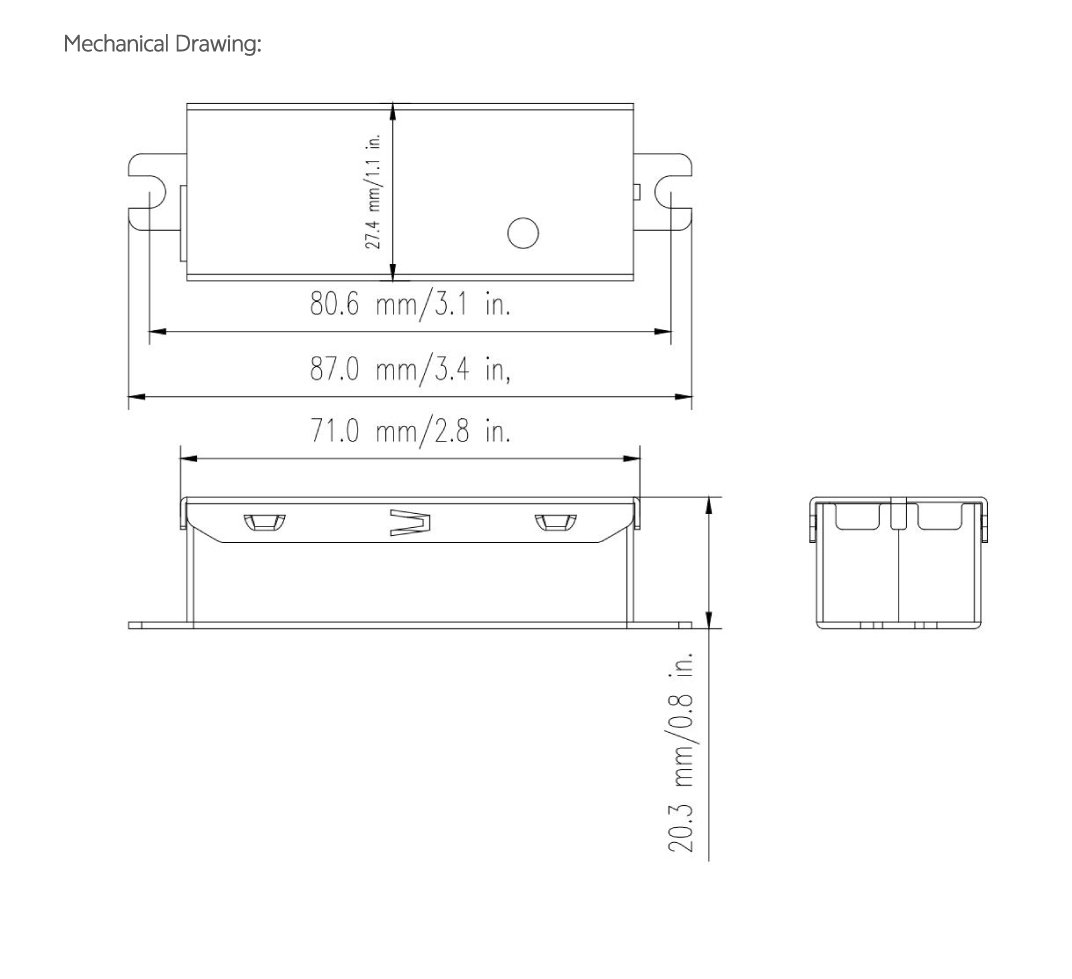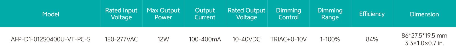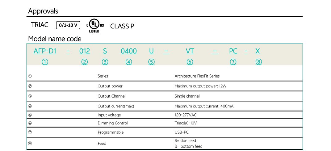 Home/All Products/AFP-D1 Family: 12W AFP-D1 Family: 12W Universal AC Input Voltage(120-277VAC) High Power Density Design, white aluminum sheet metal case Comply with phase cut dimming and isolated 0-10V dimming, dim down to true 1% Suitable for indoor use Flicker free, excellent camera compatibility Programmable Feature: Output current(1mA step) Dim to off, Min Dimming Level Programmable conduction angles with turn-on & turn-off for TRIAC & ELV Dimming curve: Log/linear/square dim curves OTP Mode: Foldback mode, Linear decrease mode Dimming fade time Over load protection UL Class2, Class P Combination Wave 2KV, Ringwave 2.5KV Operating temperature: -25℃~+50℃ Comply with IEEE1789, UL8750 . . Model List Specifications Optional Function Downloads Model List Specifications Optional Function Side feed and bottom feed DownloadsAFP-D1-012S0400U-VT-PC 3D Drawing Approvals You may also like… AFP-C1 Family: 12W 20W 36W Read more AFS-A1 Family: 80W Read more AFP-B1 Family: 12W 25W 40W Read more