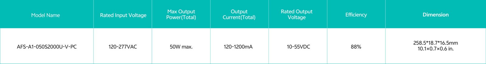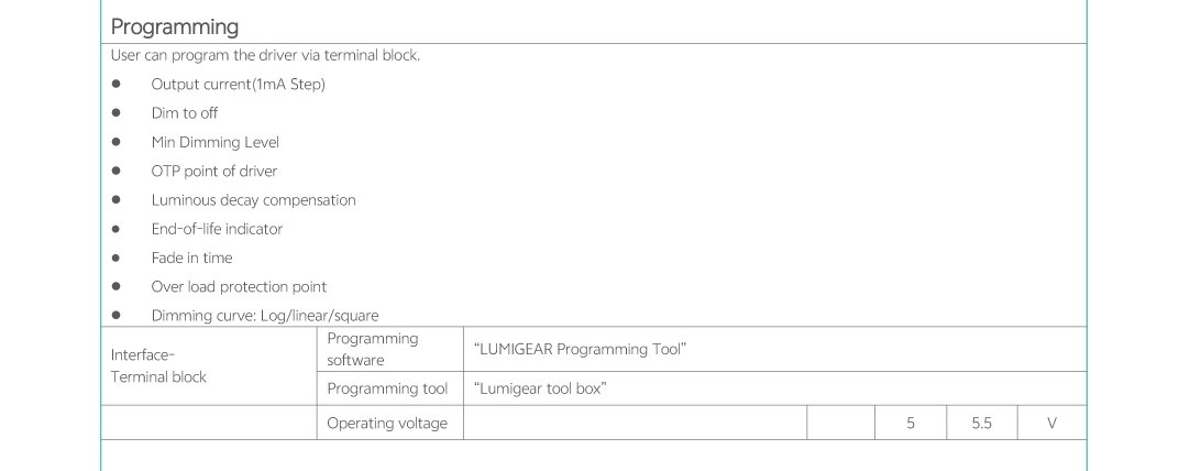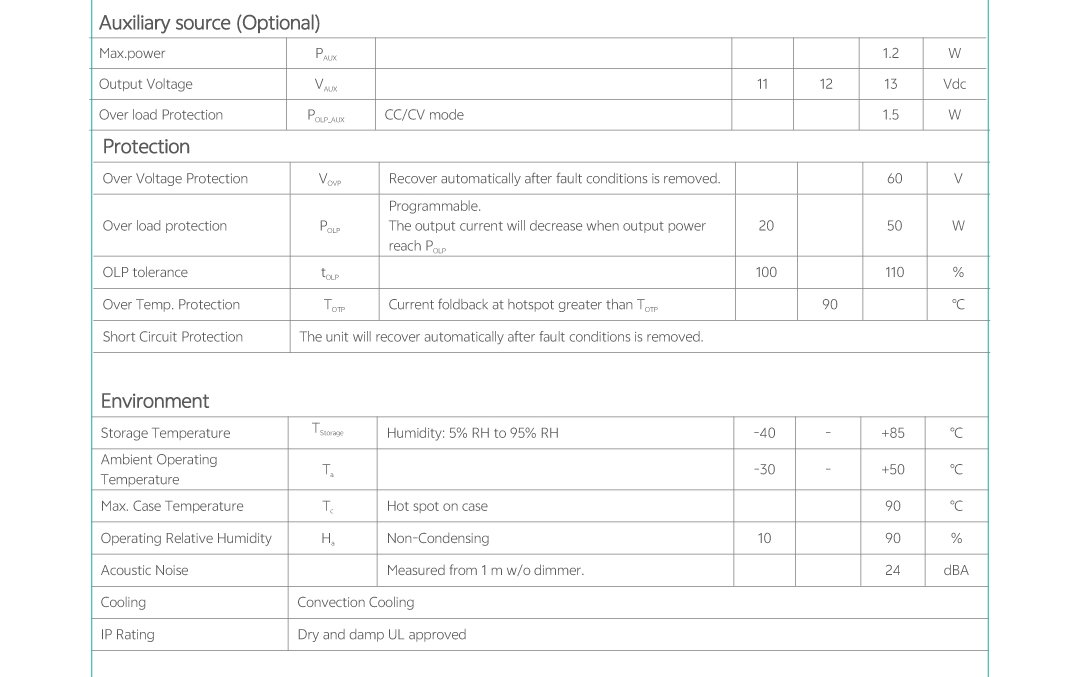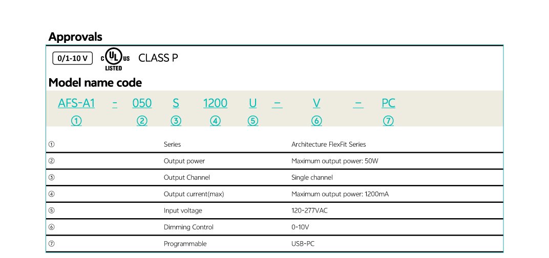 Home/All Products/AFS-A1-050S1200U-V-PC AFS-A1-050S1200U-V-PC Universal AC Input Voltage(120-277VAC) Linear form factor, Metal sheet case(white), Side feed Isolated 0-10V dimming interface, dim down to true 1.2mA Low standby power: <0.5W@120VAC Suitable for indoor use Flicker free, excellent camera compatibility, spec-grade smoothness USB Programmable Feature: Output current, Dim to off, Min Dimming Level OTP point of driver, Luminous decay compensation, End-of-life indicator, Fade in time, Over load protection point Dimming curve: Log/linear/square dim curves Class2, Class P Operating temperature: -30℃~+50℃ Comply with IEEE1789, UL8750, Category A ring wave 2.5kV . . Model List Specifications Optional Function Downloads Model List Specifications Optional Function Aux power of 12V/50mA DownloadsDatasheet 3D Drawing Approvals You may also like… AFP-D1-012S0400U-VT-PC Read more AFP-B1-012S0420U-VT-AUX-PC Read more AFP-C1-012S0400U-VT-PC Read more AFP-C1-036S1200U-VT-PC Read more