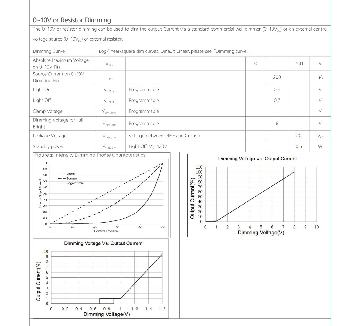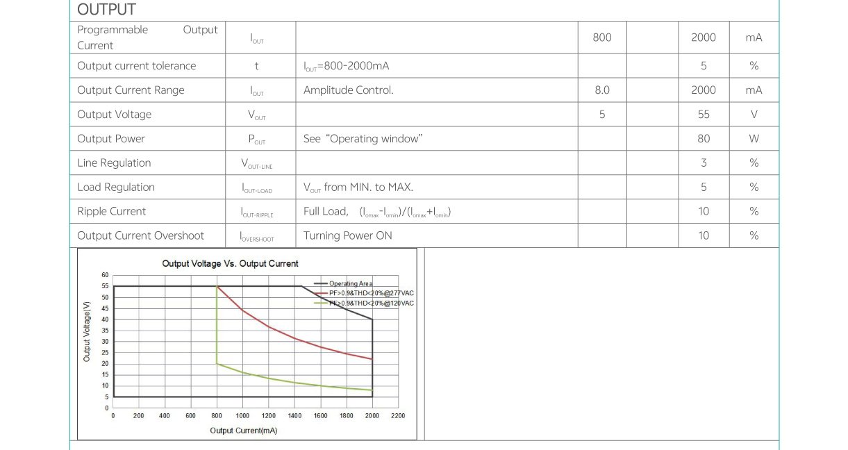 - Output current, dim to off, min dimming level