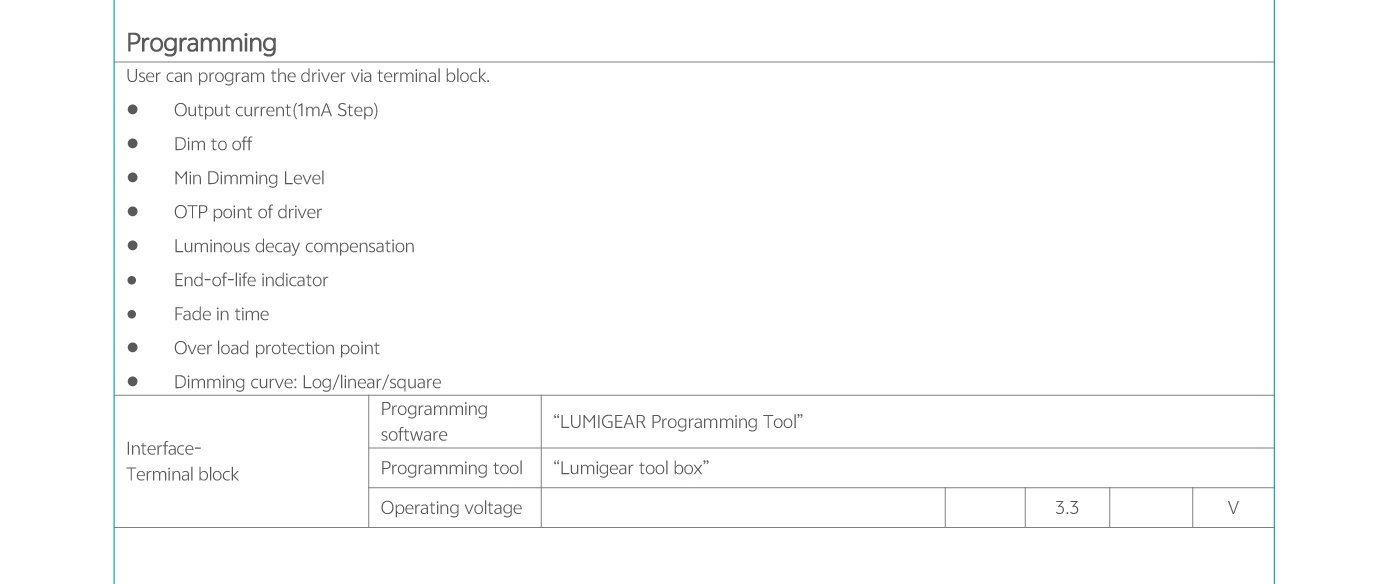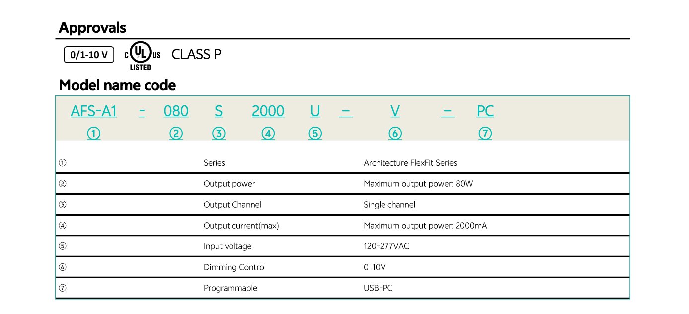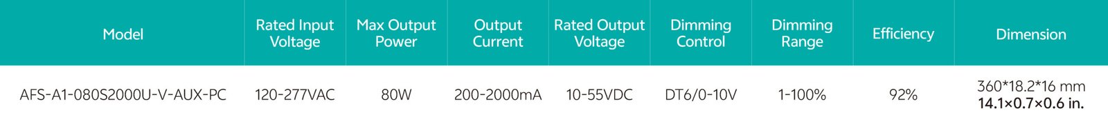 Home/All Products/AFS-A1 Family: 80W AFS-A1 Family: 80W Universal AC Input Voltage(120-277VAC) Linear form factor, Metal sheet case(white), Side feed Isolated 0-10V dimming interface, dim down to true 2.0mA Low standby power: <0.5W@120VAC Suitable for indoor use Flicker free, excellent camera compatibility, spec-grade smoothness USB Programmable Feature: Output current, Dim to off, Min Dimming Level OTP point of driver, Luminous decay compensation, End-of-life indicator, Fade in time, Over load protection point Dimming curve: Log/linear/square dim curves Class2, Class P Operating temperature: -30℃~+50℃ Comply with IEEE1789, UL8750, Category A ring wave 2.5kV . . Model List Specifications Optional Function Downloads Model List Specifications Optional Function Aux power of 12V/50mA DownloadsAFS-A1 80W 3D Drawing Approvals You may also like… AFP-B1 Family: 12W 25W 40W Read more AFP-D1 Family: 12W Read more AFP-C1 Family: 12W 20W 36W Read more