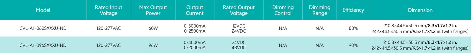 Home/All Products/CVL-A1-60W|96W CVL-A1-60W|96W Universal AC Input Voltage(120-277VAC) All-Round Protection: SCP, OVP, OTP, OPP(CC/CV mode, Especially suitable for LED strip) Flicker free, excellent camera compatibility, spec-grade smoothness Painted sheet steel Class2, Class P Operating temperature: -40℃~+55℃ Comply with IEEE1789, UL8750 . . . Model List Specifications Downloads Model List Specifications DownloadsCVL-A1-060SXXXU-ND CVL-A1-096SXXXU-ND 3D Drawing