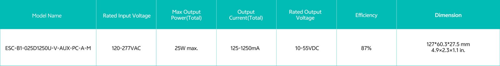 Home/All Products/ESC-B1-025D1250U-V-AUX-PC-A-M ESC-B1-025D1250U-V-AUX-PC-A-M Universal AC input voltage(120-277VAC) Compact form factor, metal sheet case Two Isolated 0-10V dimming Interfaces, dim down to true 1% Suitable for indoor use Flicker free, excellent camera compatibility Programmable feature: Output current, dim to off, min dimming level, output voltage of aux power OTP point of driver , LED thermal protection End-of-life indicator, fade in time, over load protection point Log/linear/square dim curves Selectable for dimming mode: warm dim, tunable white, and solo dimming. UL Class2, Class P Operating temperature: -30℃~+50℃ Comply IEEE1789, UL8750 . . Model List Specifications Optional Function Downloads Model List Specifications Optional Function Aux power: 12-24V programmable,1W Built-in current adjustment by 3INT switch Built-in 5CCT switch Mounting feet or stud type Digital and analog interface ready DownloadsDatasheet 3D Drawing Approvals You may also like… ESC-A1-055S2000U-V-AUX-PC Read more ESL-A1-030S1050U-V-AUX-PC Read more ESC-A1-040S1400U-V-AUX-PC Read more ESL-A1-050S1400U-V-AUX-PC Read more