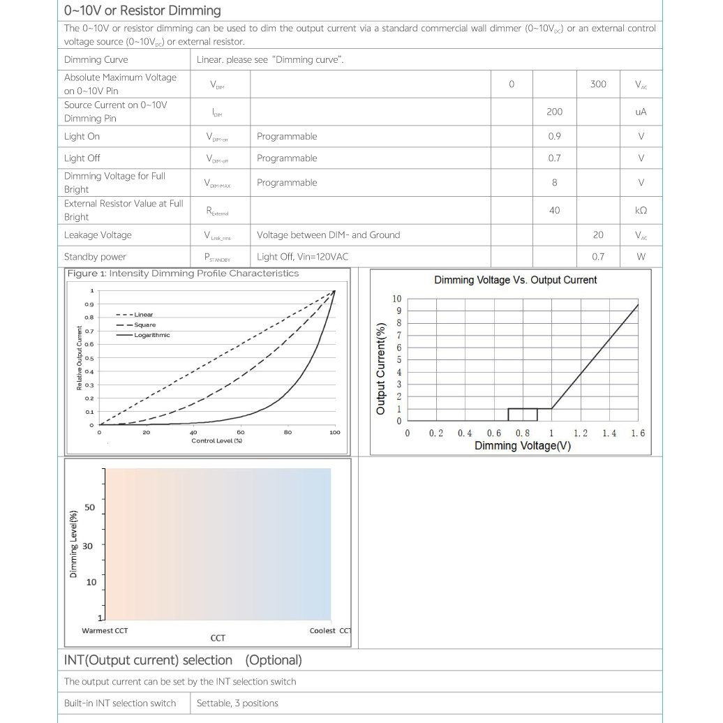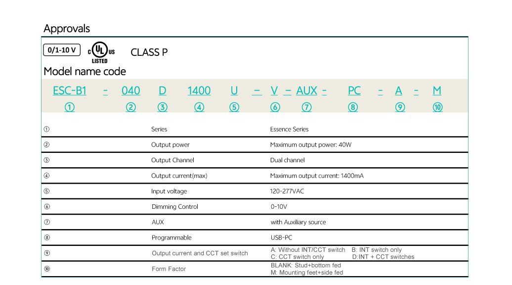 Home/All Products/ESC-B1-040D1400U-V-AUX-PC-A-M ESC-B1-040D1400U-V-AUX-PC-A-M Universal AC input voltage(120-277VAC) Compact form factor, metal sheet case Two Isolated 0-10V dimming Interfaces, dim down to true 1% Suitable for indoor use Flicker free, excellent camera compatibility Programmable feature: Output current, dim to off, min dimming level, output voltage of aux power OTP point of driver , LED thermal protection End-of-life indicator, fade in time, over load protection point Log/linear/square dim curves Selectable for dimming mode: warm dim, tunable white, and solo dimming. UL Class2, Class P Operating temperature: -30℃~+50℃ Comply IEEE1789, UL8750 . . Model List Specifications Optional Function Downloads Model List Specifications Optional Function Aux power: 12-24V programmable,1W Built-in current adjustment by 3INT switch Built-in 5CCT switch Mounting feet or stud type Digital and analog interface ready DownloadsDatasheet 3D Drawing Approvals You may also like… ESC-A1-040S1400U-V-AUX-PC Read more ECS-A1-012S0600U-V-AUX-PC Read more ESL-A1-050D1400U-V-AUX-PC Read more ESL-A1-085S2300U-V-AUX-PC Read more
