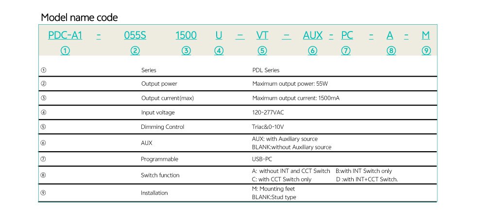 Model List Specifications Optional Function Aux power: 12-24V programmable,1W Built-in 3 current adjustment by INT switch Built-in 3/4/5CCT switch Mounting feet or stud type Digital and analog interface ready DownloadsPDC-A1-025S0700U-VT-AUX-PC-A-M PDC-A1-040S1200U-VT-AUX-PC-A-M PDC-A1-055S1500U-VT-AUX-PC-A-M Mounting feet+side fed 3D Drawing Stud+bottom fed 3D Drawing