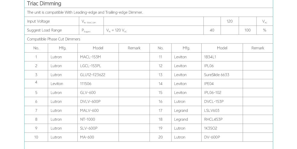 Home/All Products/PDC-A1-25W|40W|55W PDC-A1-25W|40W|55W Five‐in‐one dimming: 0-10V,1-10V,MLV,ELV,TRIAC Wide current range coverage: 40-1500 mA Wide voltage range coverage: 10-55 VDC Compact form factor, metal sheet case(white) TRIAC dimming + isolated 0-10V dimming ,dimming down to true 1% Suitable for indoor use Nominal lifetime up to 50,000 hours 5‐year warranty Programmable Features: OTP point of driver, LED thermal protection,luminous decay compensation Log/linear/square dimming curves Output current, dim to off, min dimming level Output voltage of aux power . . Model List Specifications Optional Function Downloads Model List Specifications Optional Function Aux power: 12-24V programmable,1W Built-in 3 current adjustment by INT switch Built-in 3/4/5CCT switch Mounting feet or stud type Digital and analog interface ready DownloadsPDC-A1-025S0700U-VT-AUX-PC-A-M PDC-A1-040S1200U-VT-AUX-PC-A-M PDC-A1-055S1500U-VT-AUX-PC-A-M Mounting feet+side fed 3D Drawing Stud+bottom fed 3D Drawing
