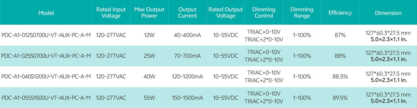 Home/All Products/PDC-A1 Family: 25W 40W 55W PDC-A1 Family: 25W 40W 55W Five‐in‐one dimming: 0-10V,1-10V,MLV,ELV,TRIAC Wide current range coverage: 40-1500 mA Wide voltage range coverage: 10-55 VDC Compact form factor, metal sheet case(white) TRIAC dimming + isolated 0-10V dimming ,dimming down to true 1% Suitable for indoor use Nominal lifetime up to 50,000 hours 5‐year warranty Programmable Features: OTP point of driver, LED thermal protection,luminous decay compensation Log/linear/square dimming curves Output current, dim to off, min dimming level Output voltage of aux power . . Model List Specifications Optional Function Downloads Model List Specifications Optional Function Aux power: 12-24V programmable,1W Built-in 3 current adjustment by INT switch Built-in 3/4/5CCT switch Mounting feet or stud type Digital and analog interface ready DownloadsPDC-A1-025S0700U-VT-AUX-PC-A-M PDC-A1-040S1200U-VT-AUX-PC-A-M PDC-A1-055S1500U-VT-AUX-PC-A-M 3D Drawing You may also like… PDL-C1 Family: 30W 50W 85W Read more