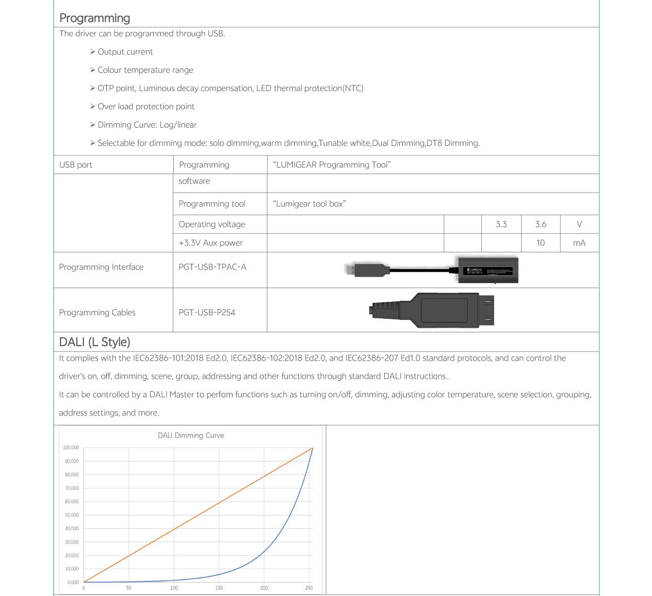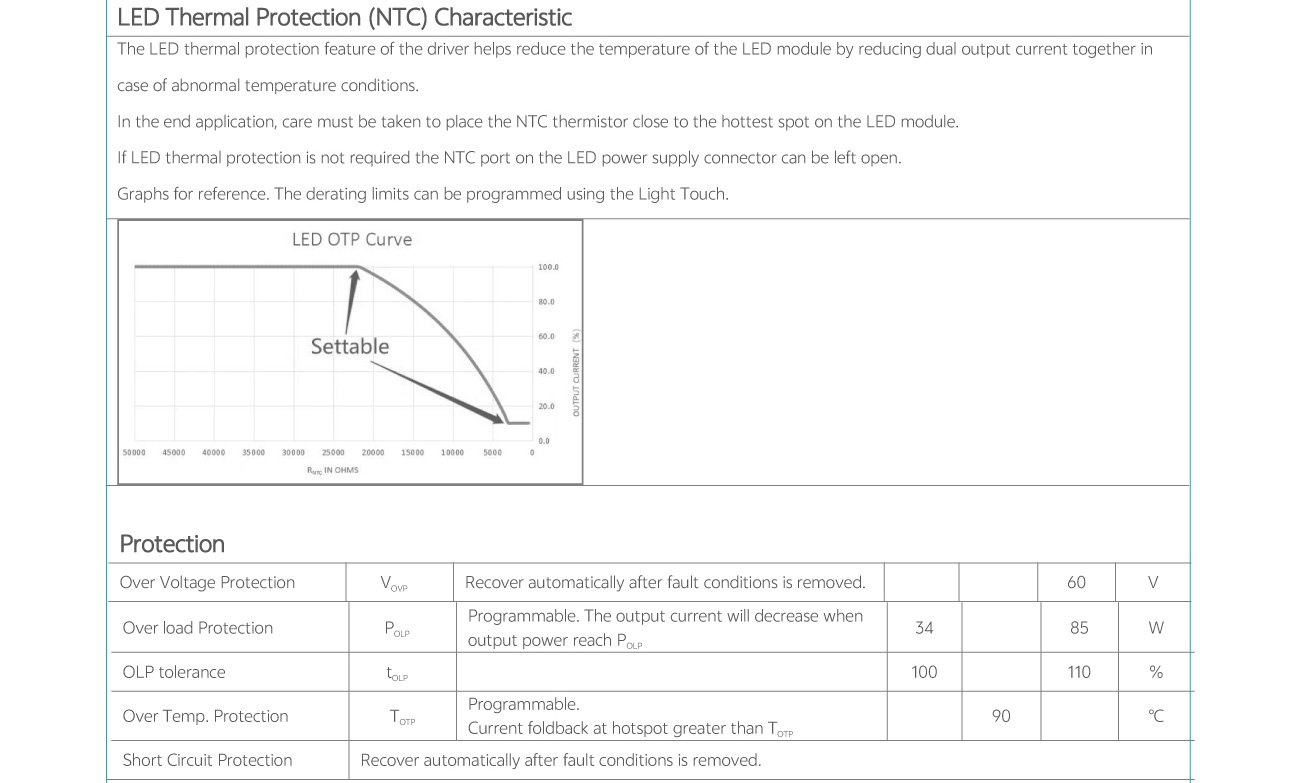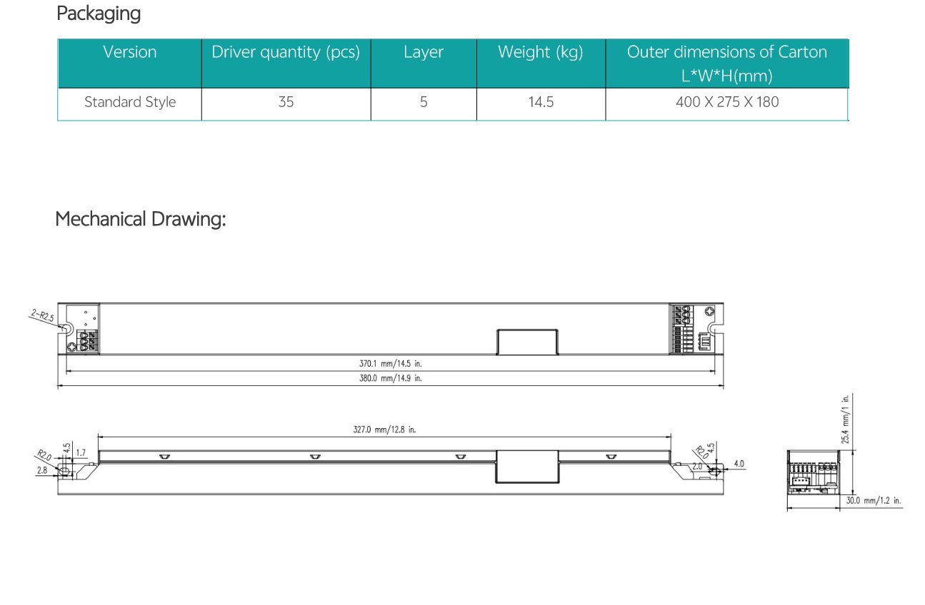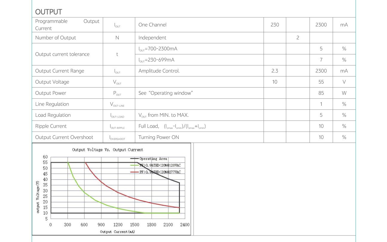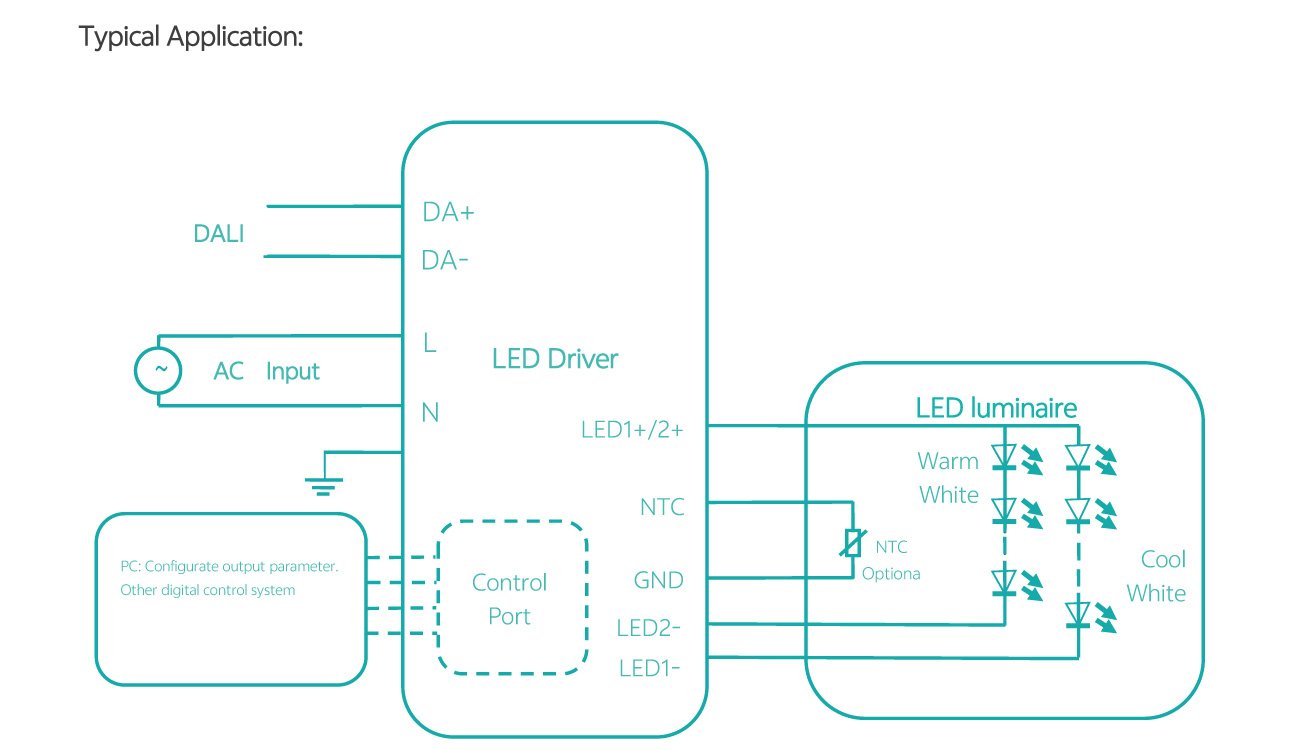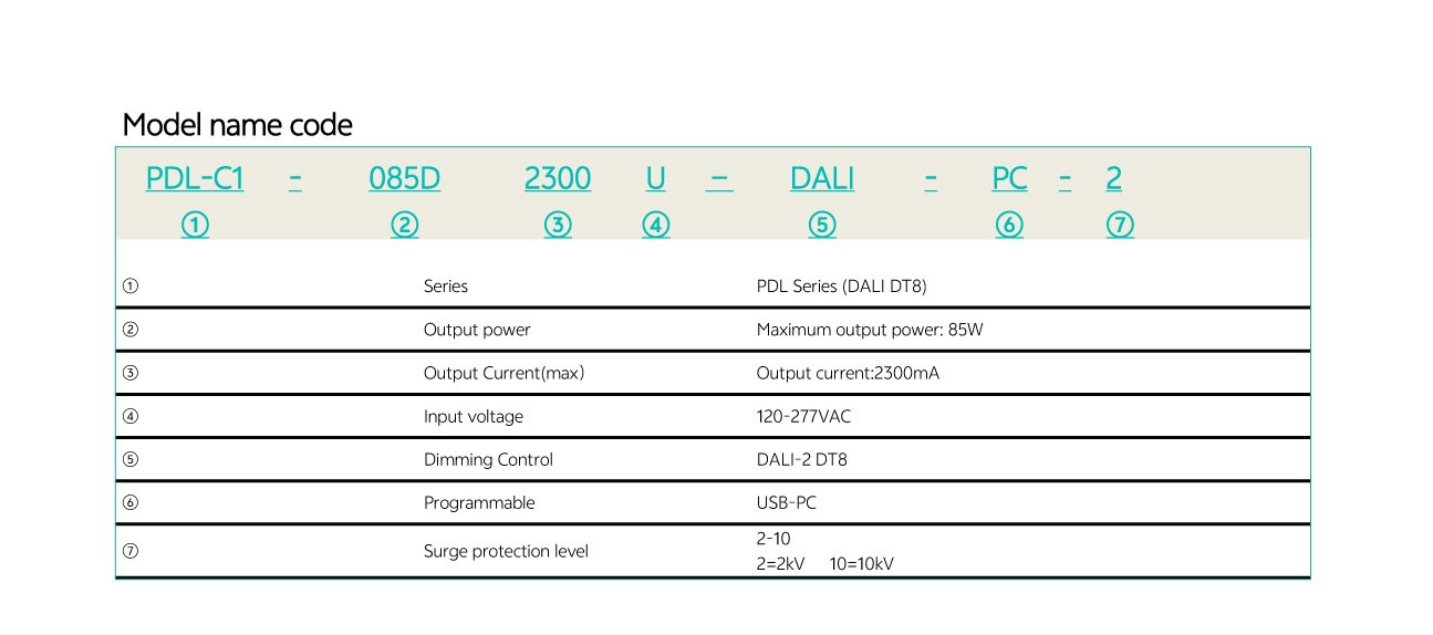 Home/All Products/PDL-C1-30W|50W|85W PDL-C1-30W|50W|85W Wide current range coverage: 140-2300 mA Wide voltage range coverage: 8-55 VDC Linear form factor, metal sheet case(white), side feed Dimmable built‐in constant current independent dual outputs LED driver, dimmimg down to true 1%. DALI-2 Standard: IEC62386-101{ed2.0}-2014,IEC62386-102{ed2.0}-2014, IEC62386-207{ed2.0}-2018,IEC62386-209{ed1.0}-2011 Suport DALl‐2 Part: 250 251252 253 Low standby power: <0.7W@120VAC Suitable for indoor use Nominal lifetime up to 50,000 hours 5‐year warranty Programmable Feature: Selectable dimming modes:solo dimming, warm dimming, tunable white, dual dimming, DT8 dimming. Overload protection point Dimming curve: log/linear OTP point, luminous decay compensation, LED thermal protection(NTC) Colour temperature range Output current . . Model List Specifications Downloads Model List Specifications DownloadsPDL-C1-030D1400X-DALI-PC PDL-C1-050D1400X-DALI-PC PDL-C1-085D2300X-DALI-PC-2 3D Drawing 30/50W 3D Drawing 85W