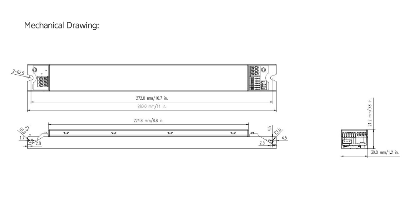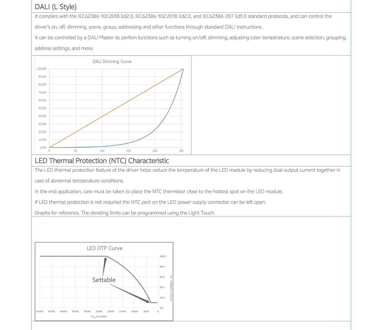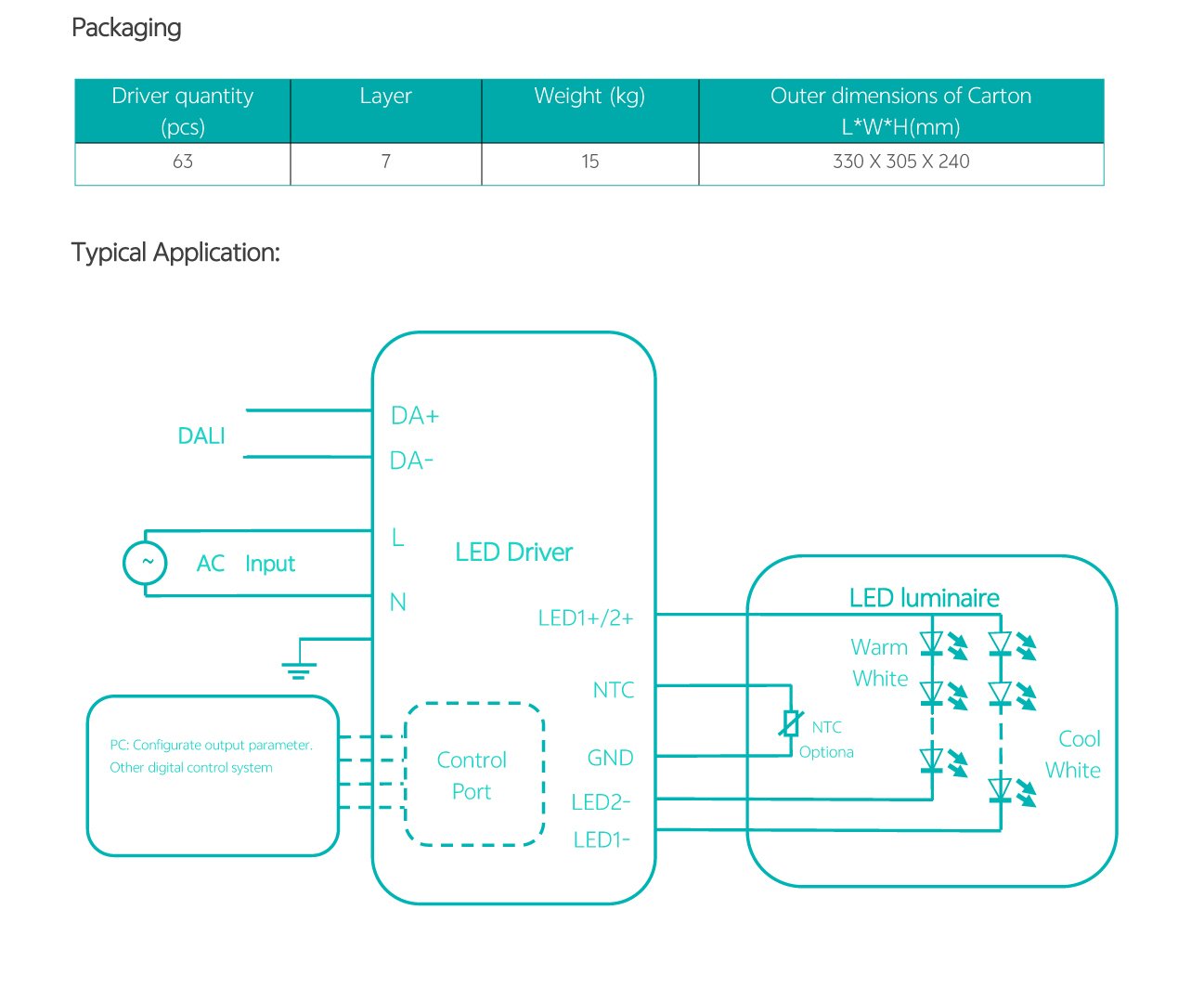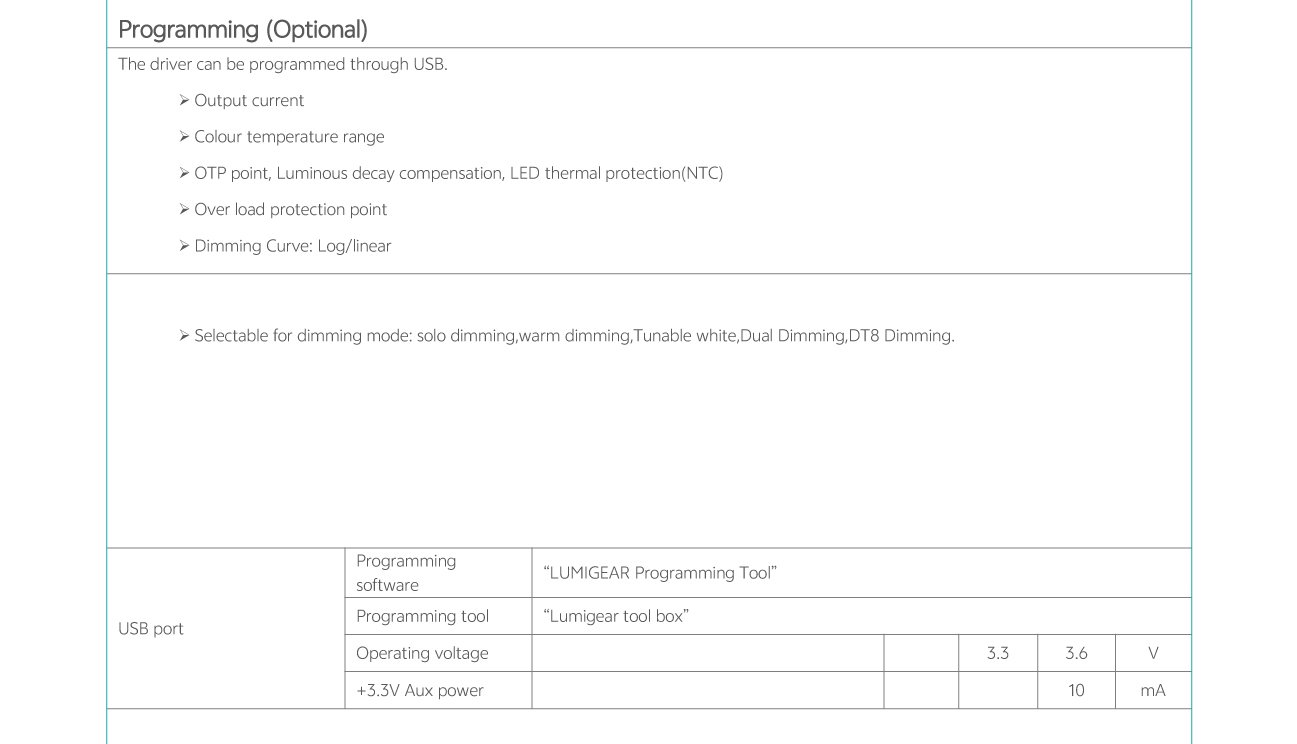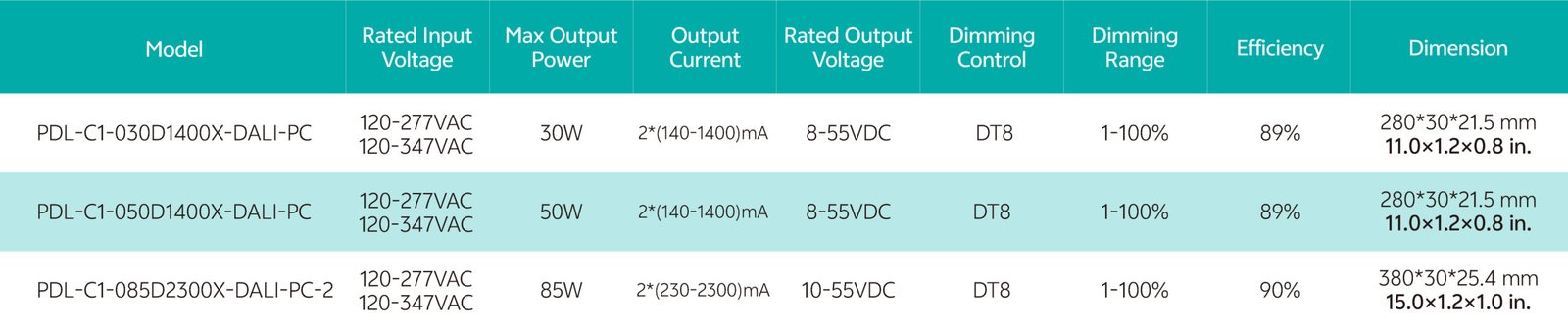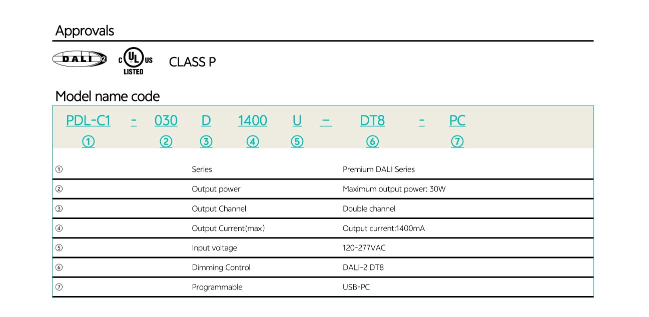 Home/All Products/PDL-C1 Family: 30W 50W 85W PDL-C1 Family: 30W 50W 85W Wide current range coverage: 140-2300 mA Wide voltage range coverage: 8-55 VDC Linear form factor, metal sheet case(white), side feed Dimmable built‐in constant current independent dual outputs LED driver, dimmimg down to true 1%. DALI-2 Standard: IEC62386-101{ed2.0}-2014,IEC62386-102{ed2.0}-2014, IEC62386-207{ed2.0}-2018,IEC62386-209{ed1.0}-2011 Suport DALl‐2 Part: 250 251252 253 Low standby power: <0.7W@120VAC Suitable for indoor use Nominal lifetime up to 50,000 hours 5‐year warranty Programmable Feature: Selectable dimming modes:solo dimming, warm dimming, tunable white, dual dimming, DT8 dimming. Overload protection point Dimming curve: log/linear OTP point, luminous decay compensation, LED thermal protection(NTC) Colour temperature range Output current . . Model List Specifications Downloads Model List Specifications DownloadsPDL-C1-030D1400X-DALI-PC PDL-C1-050D1400X-DALI-PC PDL-C1-085D2300X-DALI-PC-2 3D Drawing 30/50W 3D Drawing 85W Approvals You may also like… PDC-A1 Family: 25W 40W 55W Read more