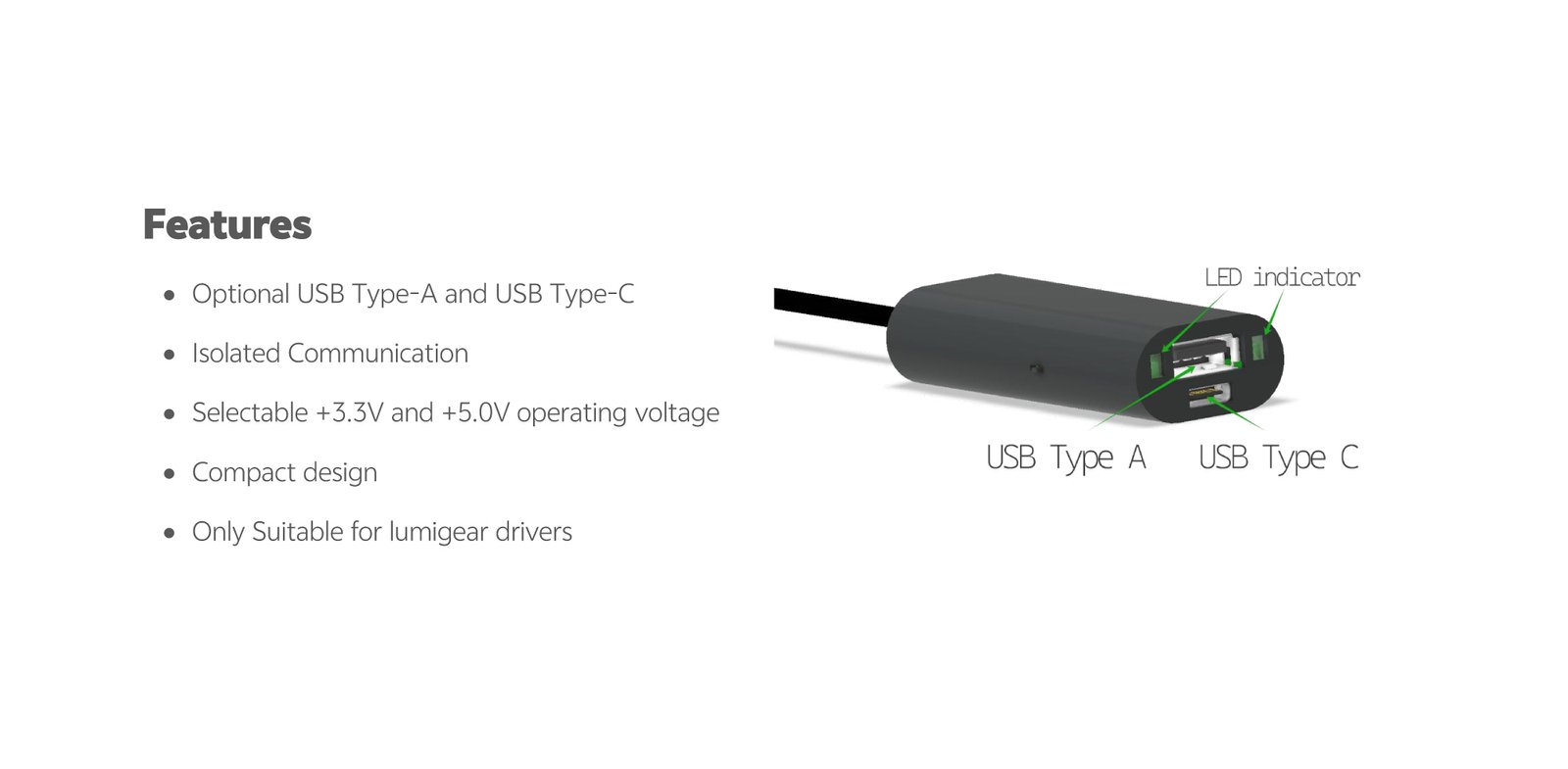 Home/All Products/Programming Interface Programming Interface Optional USB Type-A and USB Type-C Isolated Communication Selectable +3.3V and +5.0V operating voltage Compact design Only Suitable for lumigear drivers Model List Specifications Downloads Model List Specifications DownloadsDatasheet You may also like… ESL-A1 Family: 23W 30W 50W 60W 85W Read more ESC-A1 Family: 12W 25W 40W 55W Read more